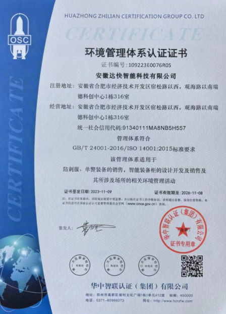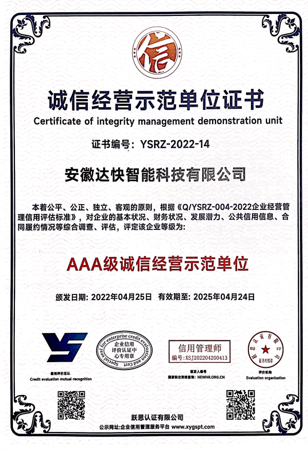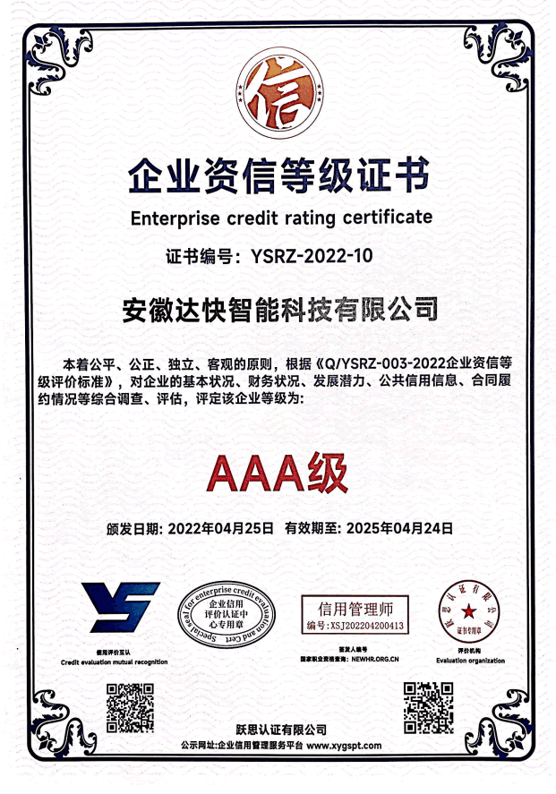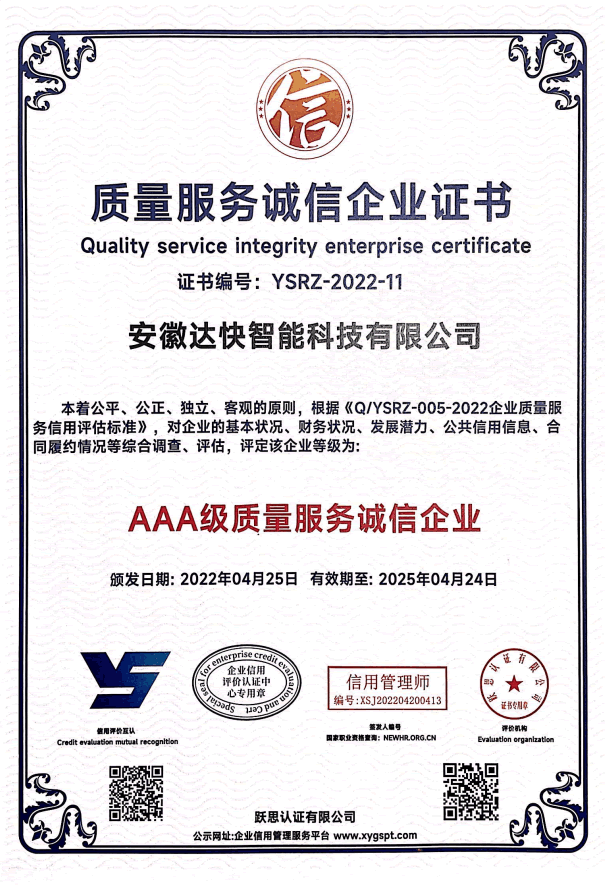 產品質量卓越:安徽達快智能科技有限公司的產品嚴格按照國際質量管理體系標準生產,并通過了多項認證,如ISO9001、ISO14001等。公司注重細節和品質控制,確保每一批產品都符合高質量標準,讓使用單位放心。